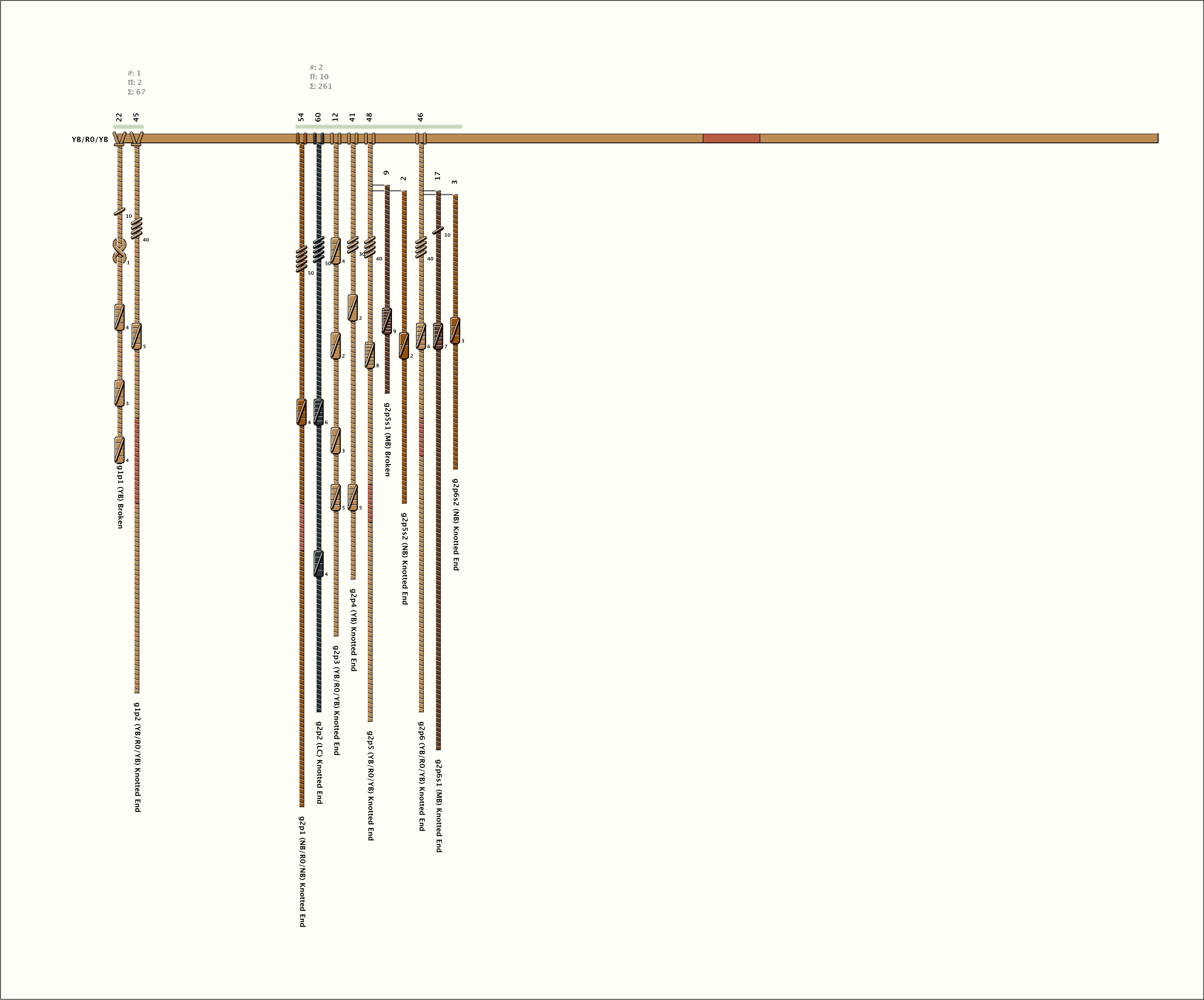 # of Groups & Cords: 2 Groups, 12 Cords - (8p, 4s) # of Ascher Cord Colors: 5 Similar Khipu: Previous (KH0579) Next (KH0654) Catalog: KH0657 Khipu Notes: Khipu Notes |