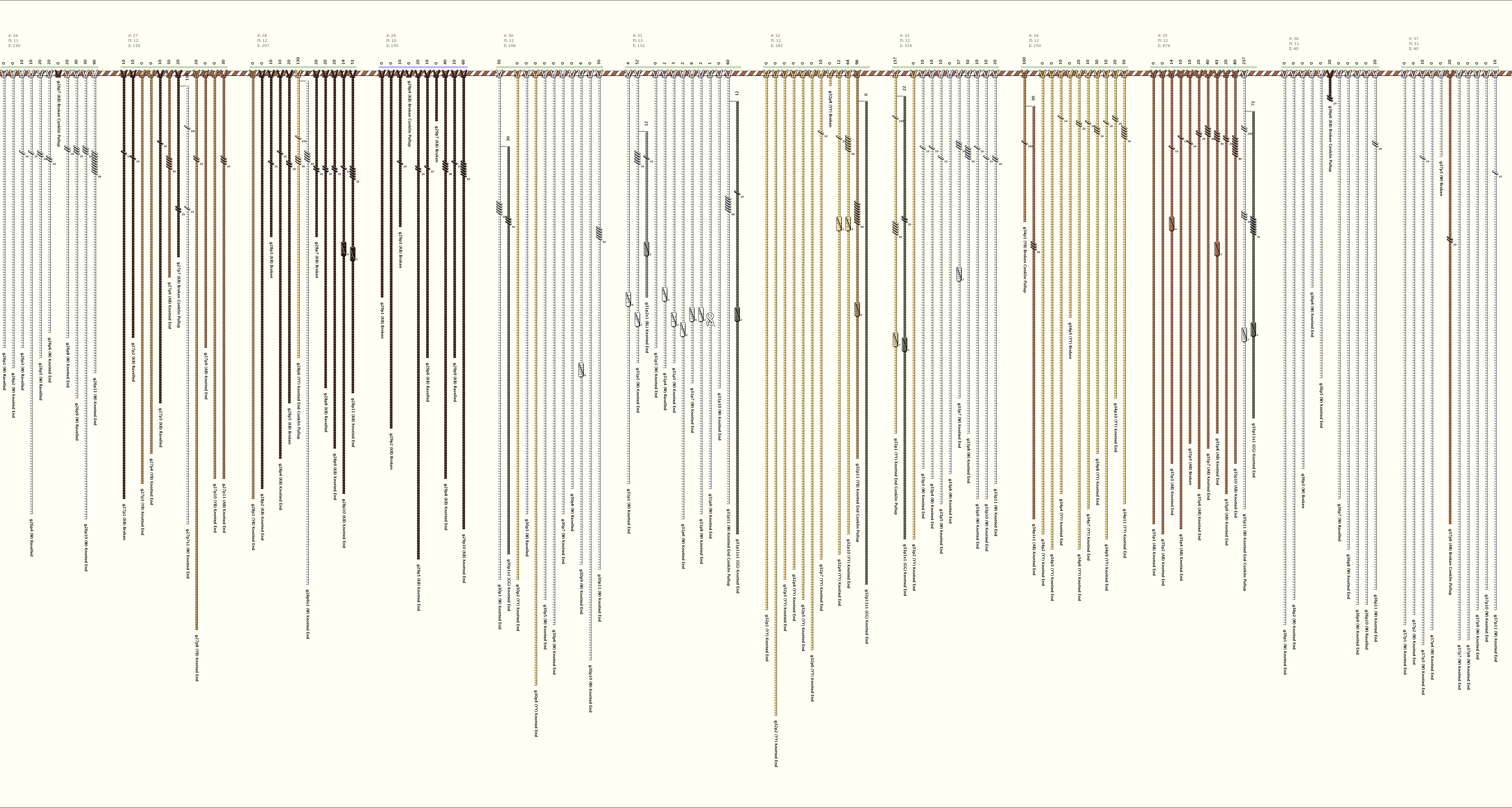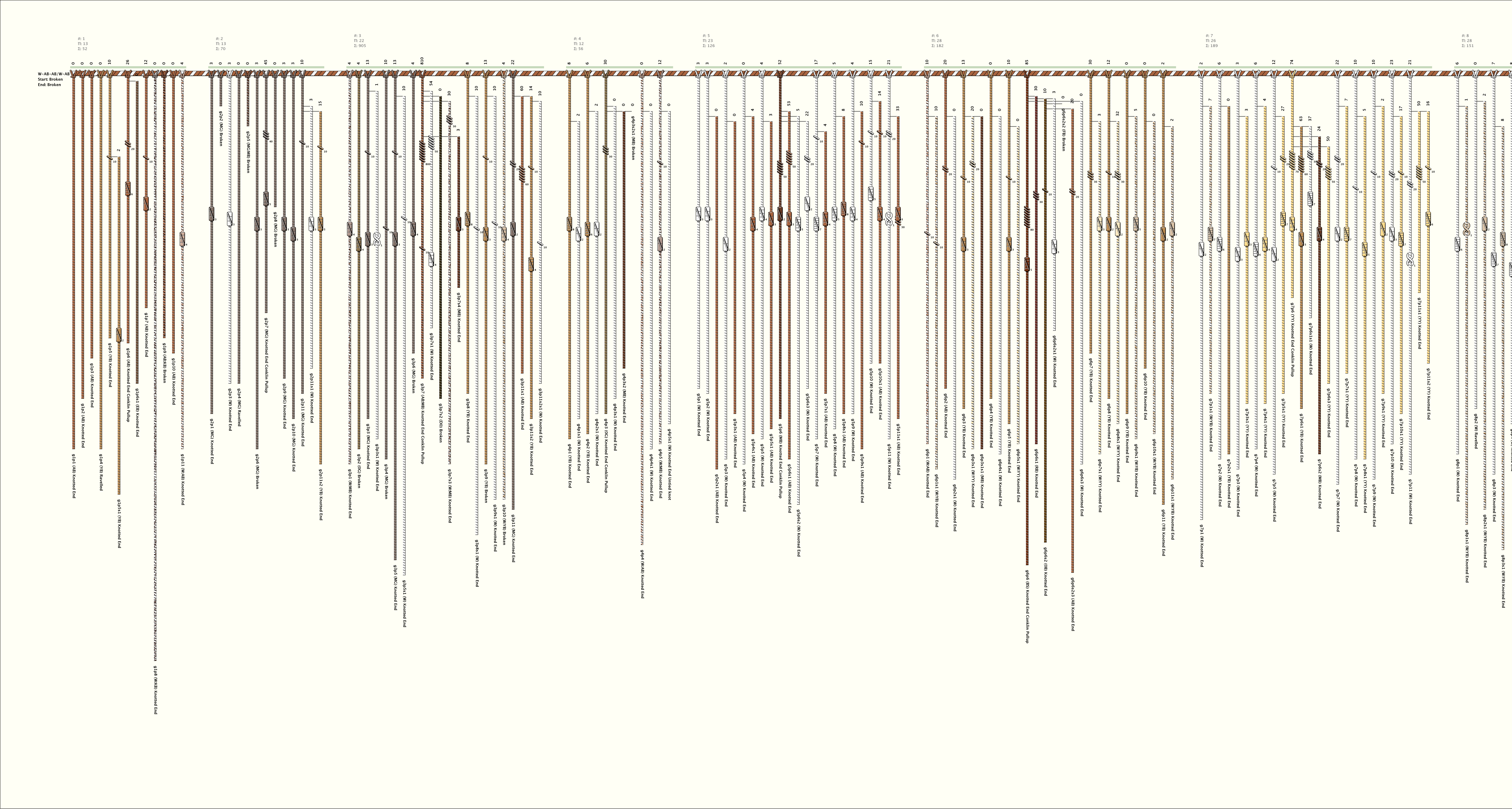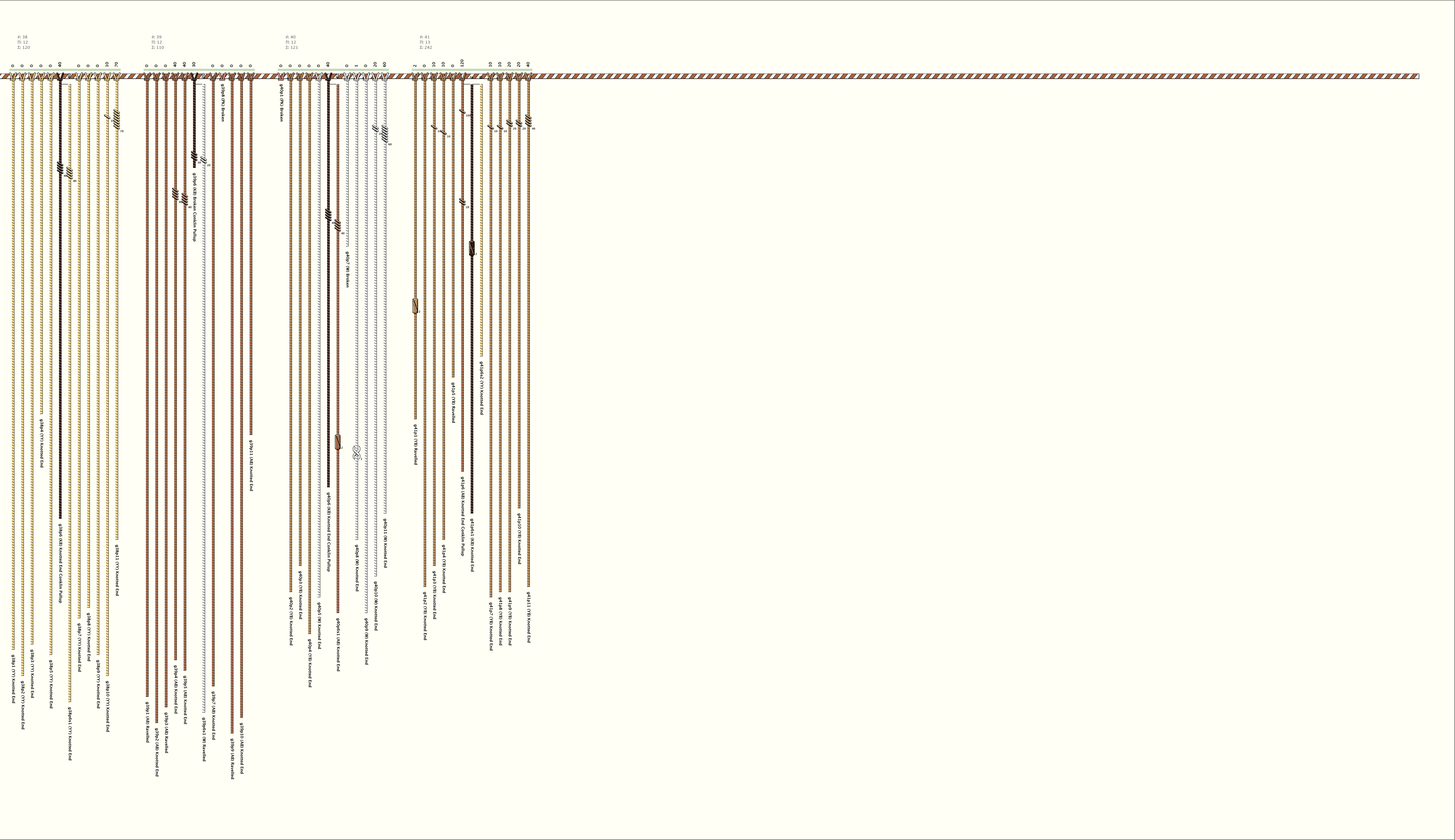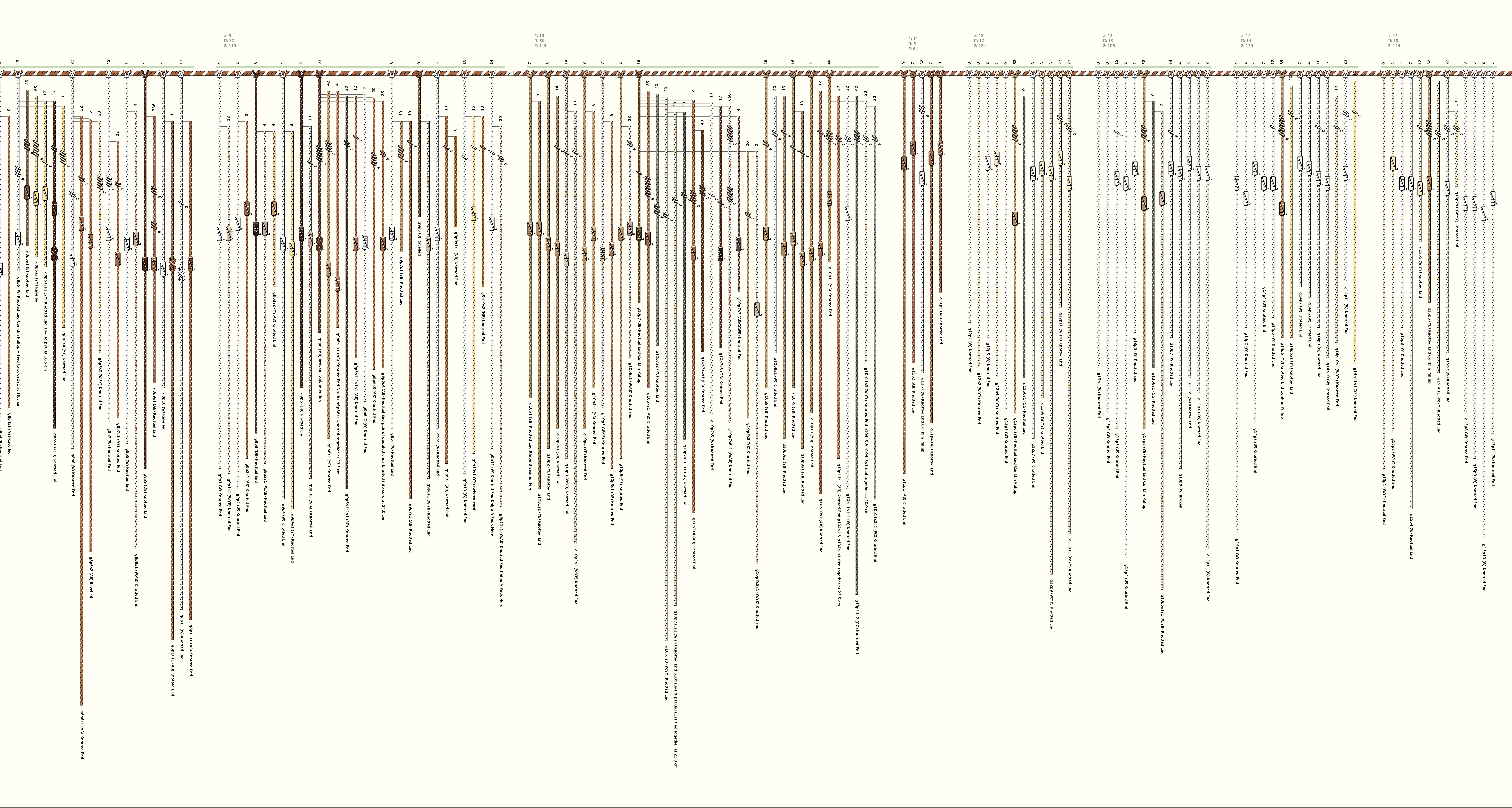 # of Groups & Cords: 41 Groups, 623 Cords - (438p, 185s) # of Ascher Cord Colors: 39 Similar Khipu: Previous (KH0593) Next (KH0401) Catalog: KH0674 Khipu Notes: Khipu Notes |