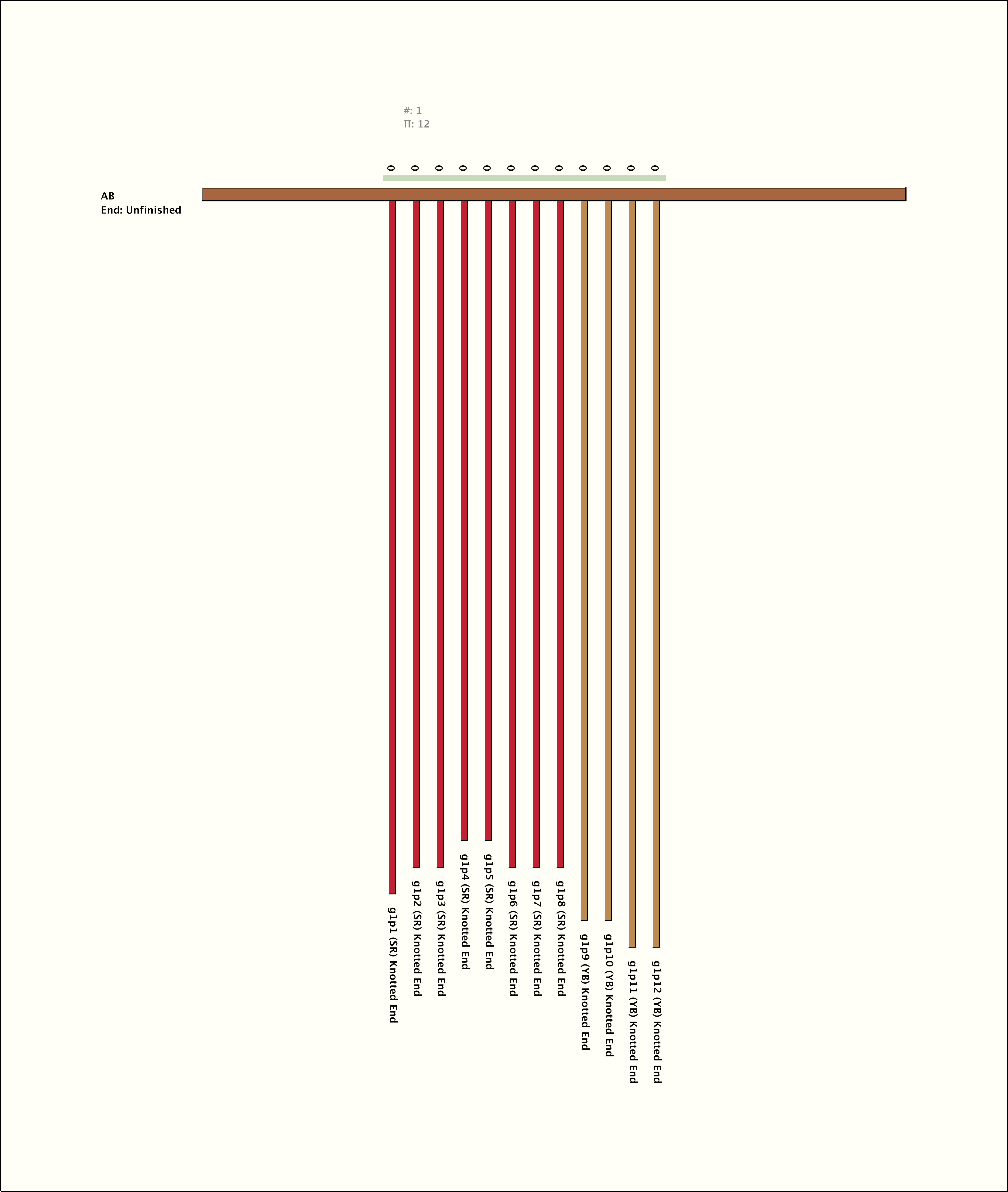 # of Groups & Cords: 1 Groups, 12 Cords - 12p # of Ascher Cord Colors: 3 Similar Khipu: Previous (KH0086) Next (KH0023) Catalog: RA002 Khipu Notes: |