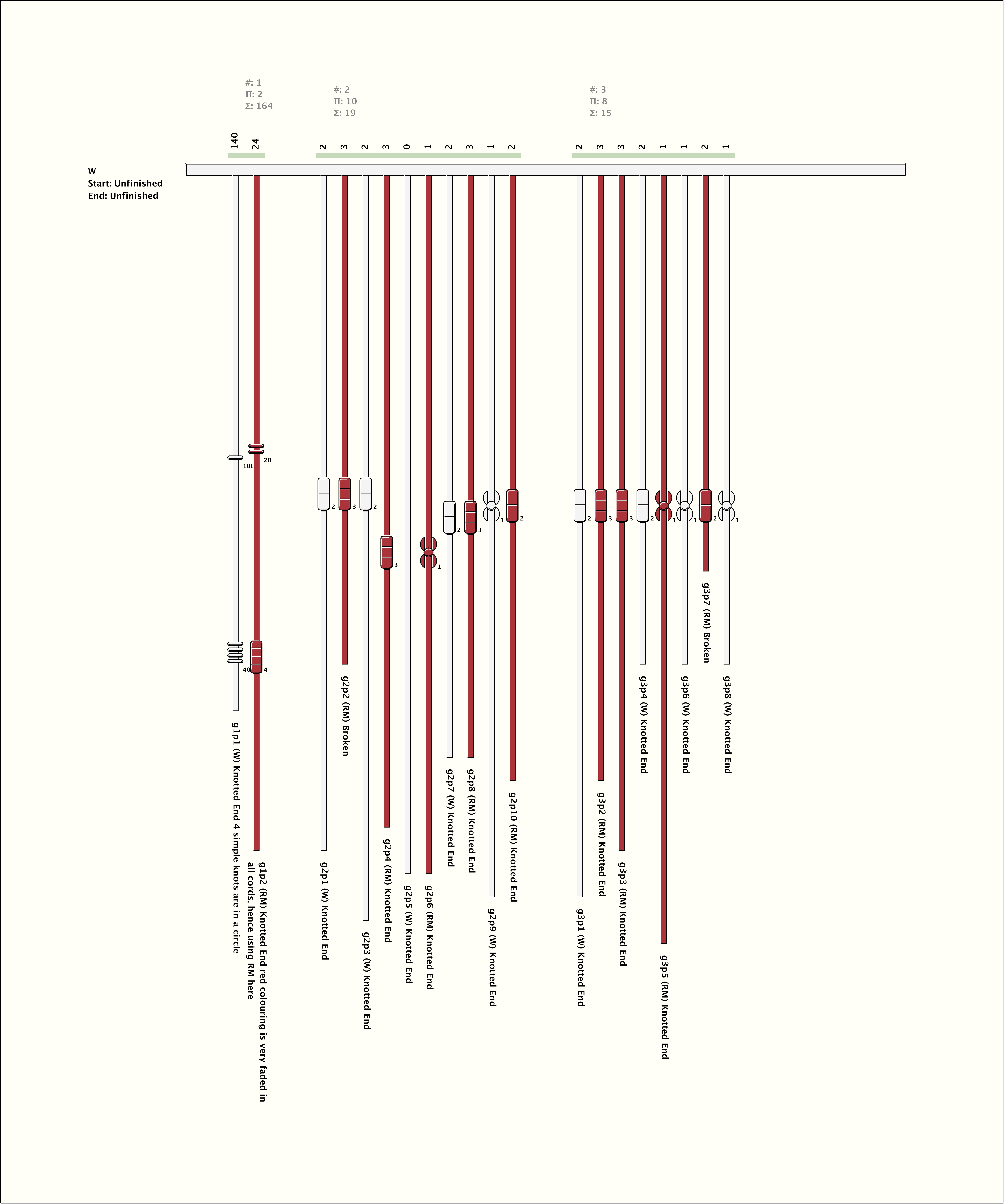 # of Groups & Cords: 3 Groups, 20 Cords - 20p # of Ascher Cord Colors: 2 Similar Khipu: Previous (KH0054) Next (KH0035) Catalog: RA008 Khipu Notes: |