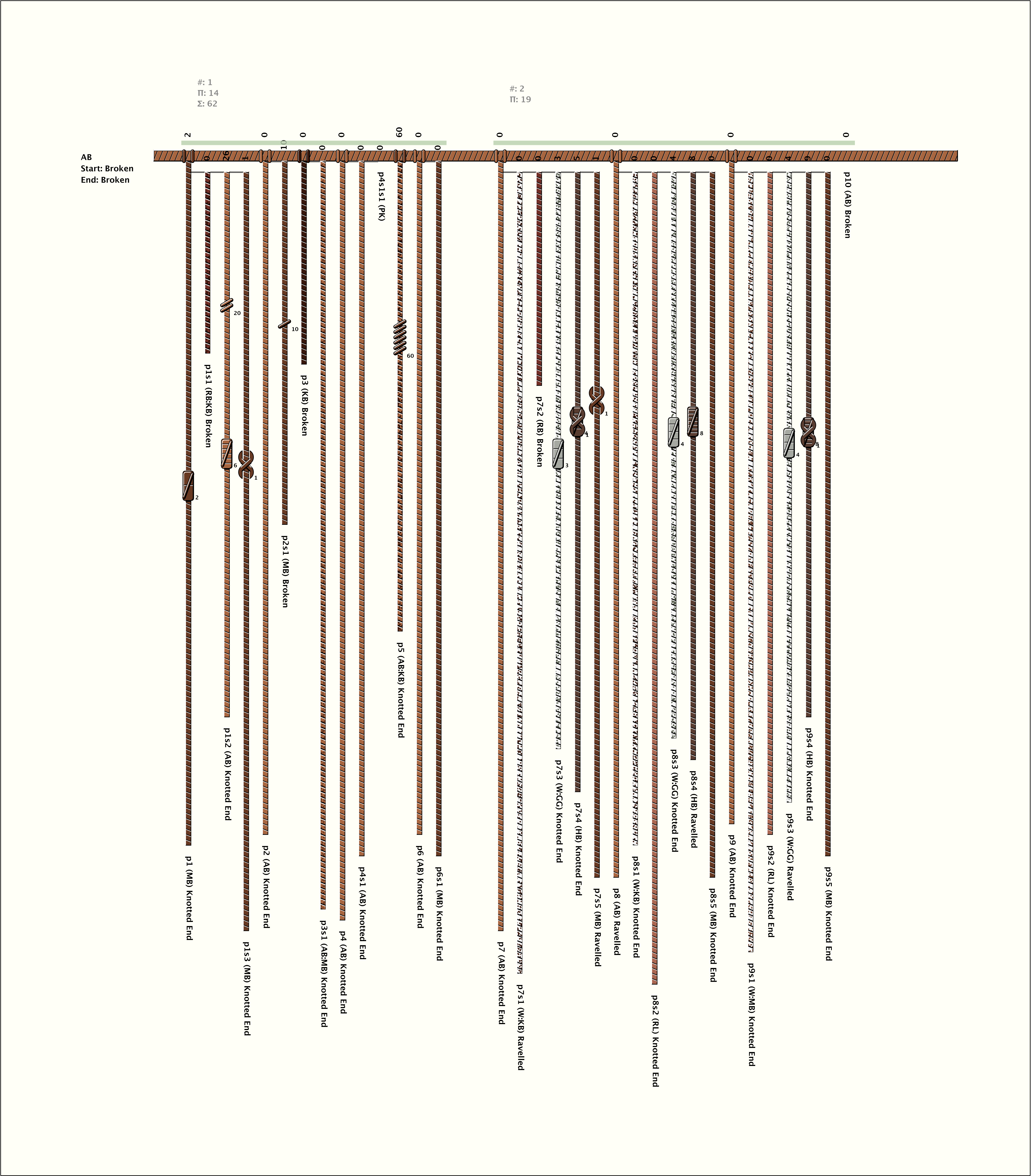 Total Number of Cords: 33 Number of Ascher Cord Colors: 13 Similar Khipu: Previous (HP016) Next (UR175) Catalog: UR109 Khipu Notes: Khipu Notes |