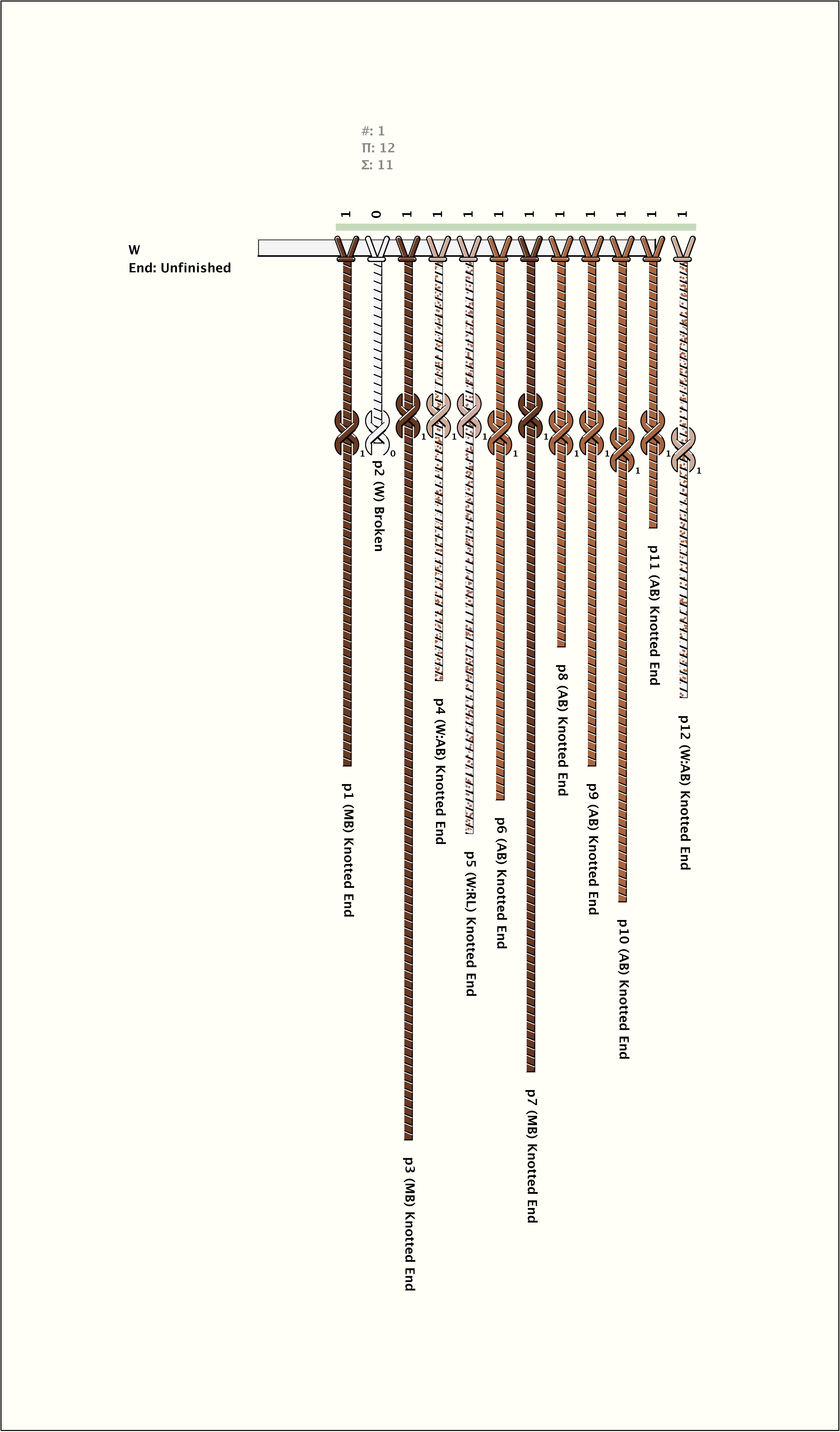 Total Number of Cords: 12 Number of Ascher Cord Colors: 5 Similar Khipu: Previous (UR227) Next (UR181) Catalog: UR134 Khipu Notes: |