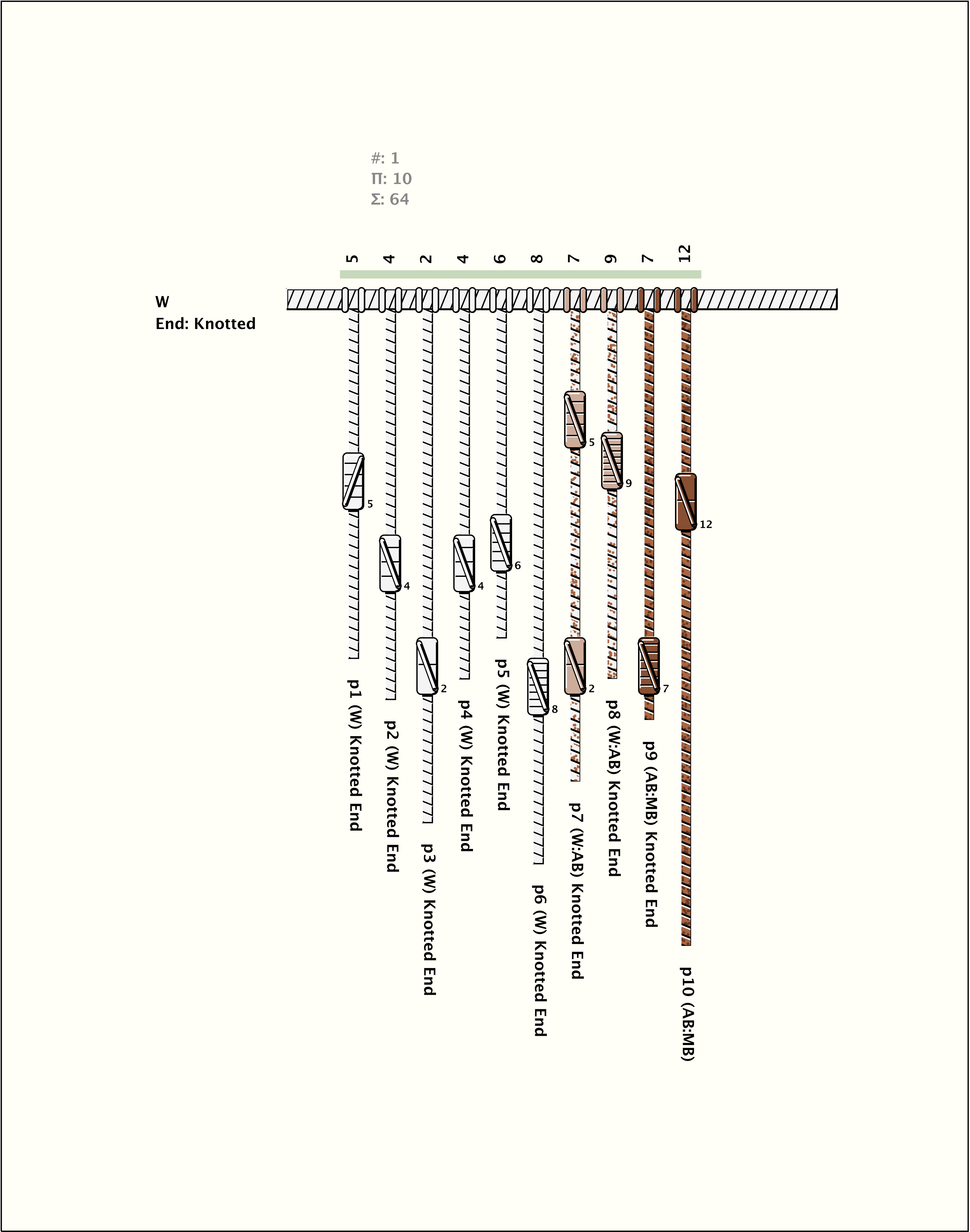 Total Number of Cords: 10 Number of Ascher Cord Colors: 3 Similar Khipu: Previous (AS193) Next (UR060) Catalog: UR157 Khipu Notes: Khipu Notes |
