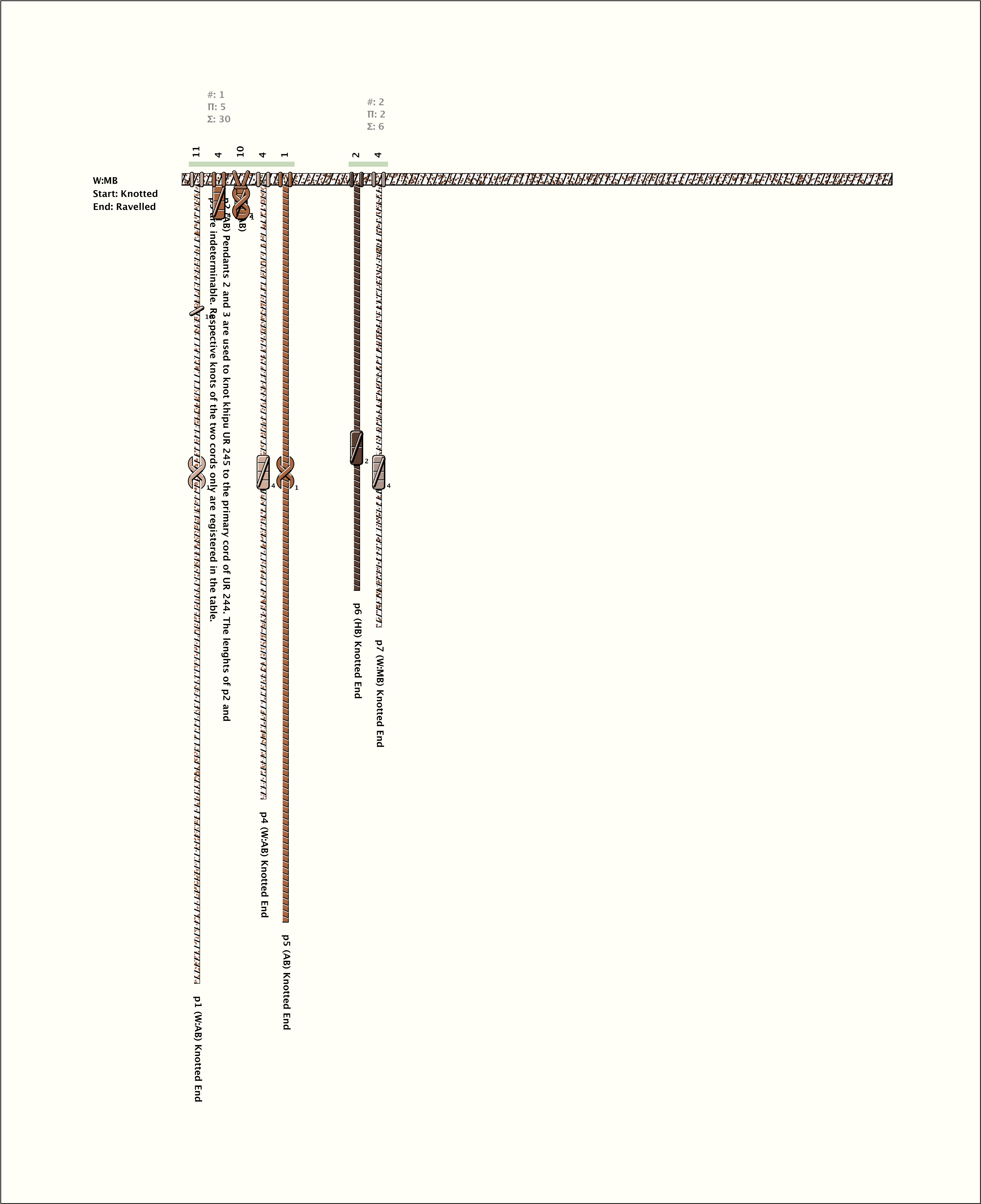 Total Number of Cords: 7 Number of Ascher Cord Colors: 4 Similar Khipu: Previous (QU008) Next (UR1033B) Catalog: UR245 Khipu Notes: |